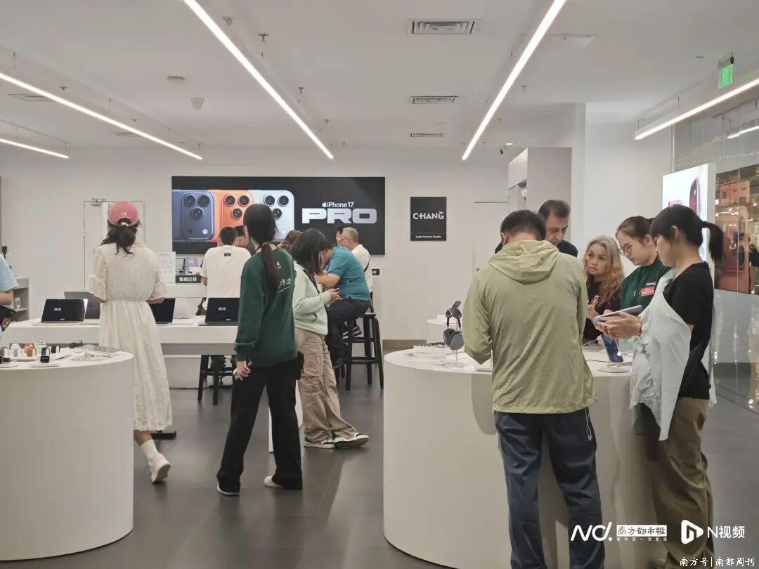 一电子产品门店内,多名境外消费者正在购物咨询中。